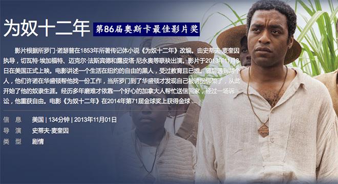 电影《为奴十二年》在2014年第71届金球奖上获得金球奖最佳剧情片[2]  。而在第86届奥斯卡金像奖颁奖礼上,《为奴十二年》获得了最佳影片奖、最佳女配角、最佳改编剧本奖三项大奖[3]