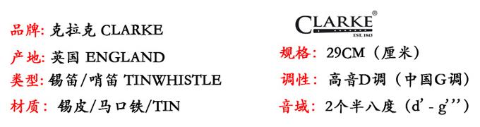 有着165年历史的克拉克锡笛被公认为是锡笛中的“史特拉第瓦里提琴”(Stradivarius)。克拉克锡笛是由锡片和一个木制笛嘴组成,制作全过程都是通过精美的手工完成。最重要的是,它仍沿用十九世纪中期的传统工艺:采用锡片作原料,加上个圆锥笛身,使得克拉克锡笛具有自身独特的音质,称之为“chiff”,使之没有任何锡笛能与之媲美。克拉克锡笛吹出来的音调十分清晰,像长笛所发出的一样。Bill Ochs描述成“清而脆”,Mary Bergin 描述成“雄浑而性感”。所有的这些描述都高度评价了“cliff”。Tommy Makem称之为“克拉克之音”,这也就克拉克锡笛的独特性所在!锡笛是一种简单而传统的乐器。它最适合于流行歌民间音乐的演奏,但它也适合其他音乐节目的表演。无论是独奏还是配合其他乐器演奏,克拉克笛都是独具特色的。它是一种男女皆适,老少皆宜的乐器。锡笛有着一段悠久的历史,也是因为具有它易携带易保管的特点.