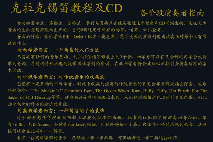 此书能让他们了解演奏切音/cut、滚音/rolls、克朗/crans、和撞音/strikes的秘诀,同时给锡笛一个展示它独具一格的风味的机会。这些技巧将会在此书中一一解说。